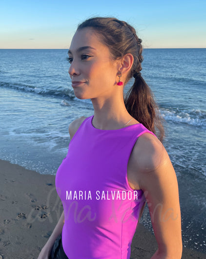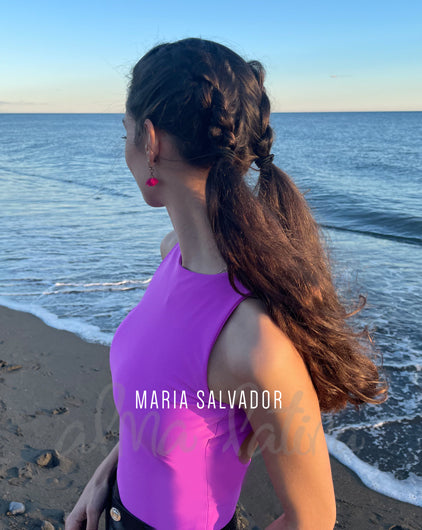 Bougainvillea dance bodysuit with a closed neckline and open back with a teardrop opening. It features built-in cups and double fabric in the bust area to prevent transparency. This, along with its elasticity, allows it to adapt to the body and allows you to move freely.