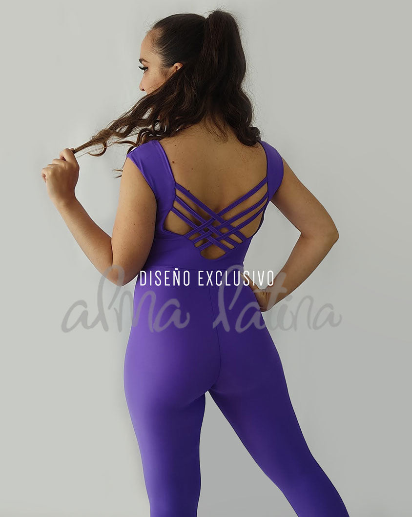 Purple cross-stitched dance jumpsuit with a sweetheart neckline, fitted off-the-shoulder sleeves, and an open back with a crisscrossing lace pattern. It features built-in cups and double fabric in the bust area to prevent sheerness. This, along with its elasticity, allows it to adapt to the body and allows you to move freely.