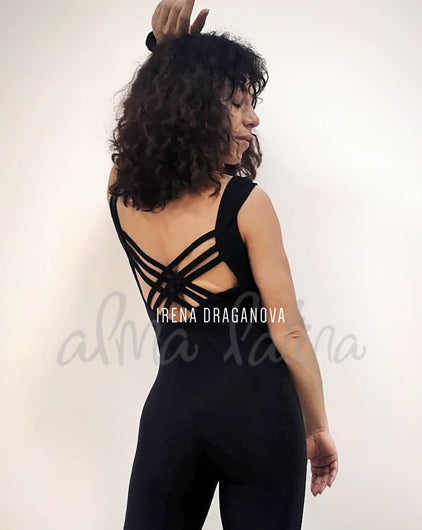 Black crisscross dance jumpsuit with a sweetheart neckline, fitted off-the-shoulder sleeves, and an open back with a crisscrossing latticework of straps. It features built-in cups and double fabric in the bust area to prevent sheerness. This, along with its elasticity, allows it to adapt to the body and allows you to move freely.
