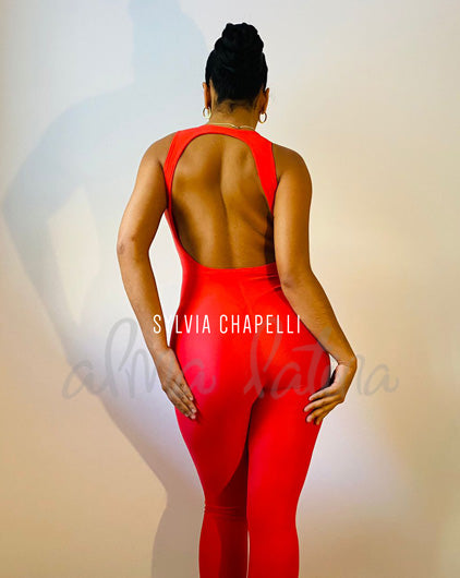 Red dance jumpsuit with a sweetheart neckline, fitted off-the-shoulder sleeves, and an open back with crisscrossing straps. It features built-in cups and double fabric in the bust area to prevent sheerness. This, along with its elasticity, allows it to adapt to the body and allows you to move freely.