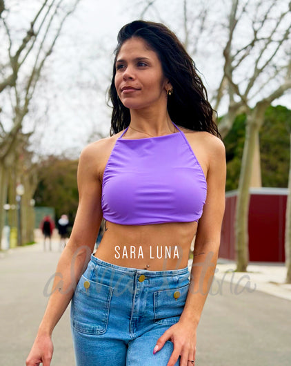 Top para bailar lila, tiene la espalda totalmente descubierta, creando un cruce por delante justo encima del pecho y se anuda al cuello. Lleva COPAS INCORPORADAS y doble tejido en la zona del pecho para evitar transparencias, esto junto a su elasticidad hace que se adapte al cuerpo y te permite moverte con libertad.