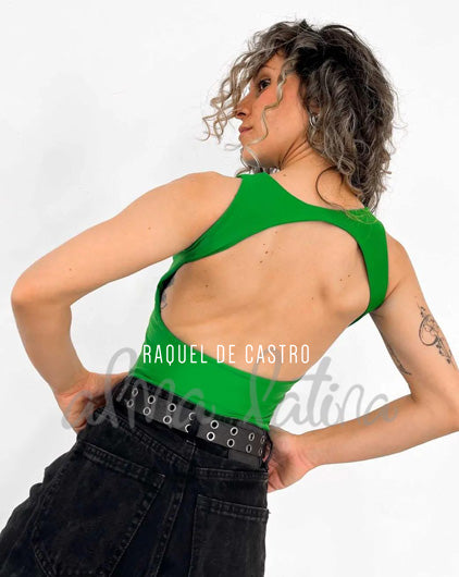Body verde para bailar, con escote cerrado y espalda al aire con abertura en forma de lágrima. Lleva COPAS INCORPORADAS y doble tejido en la zona del pecho para evitar transparencias, esto junto a su elasticidad hace que se adapte al cuerpo y te permite moverte con libertad.