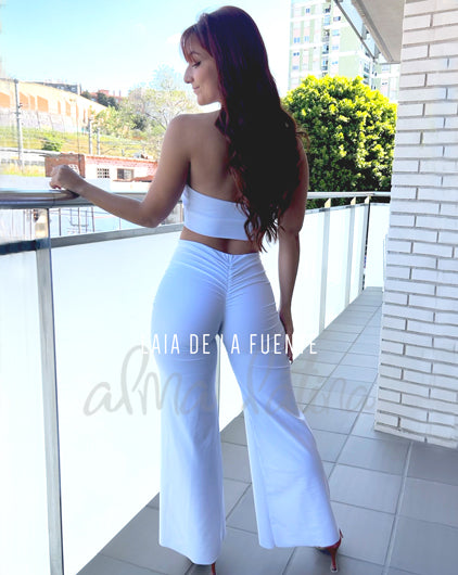 Pantalón de baile blanco de pata ancha, con fruncido en el glúteo y cintura alta. Es elástico y comodísimo a la vez que elegante.