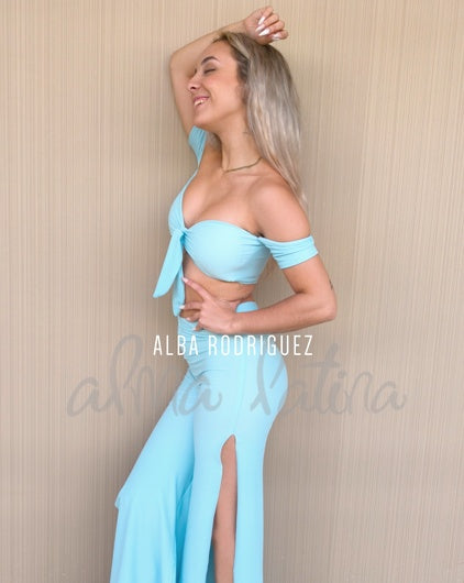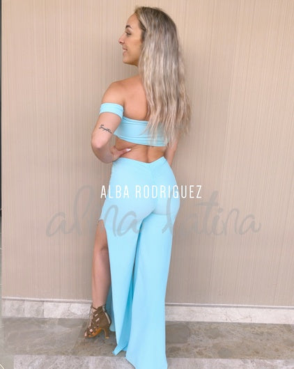 Pantalones de baile azul bebé con abertura en el lateral. Con pata ancha, cintura alta y fruncido push-up entre los glúteos.
