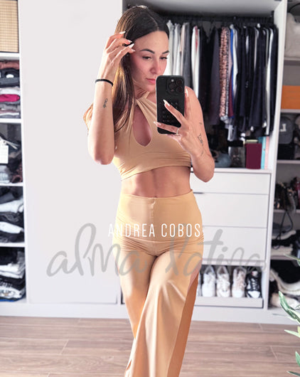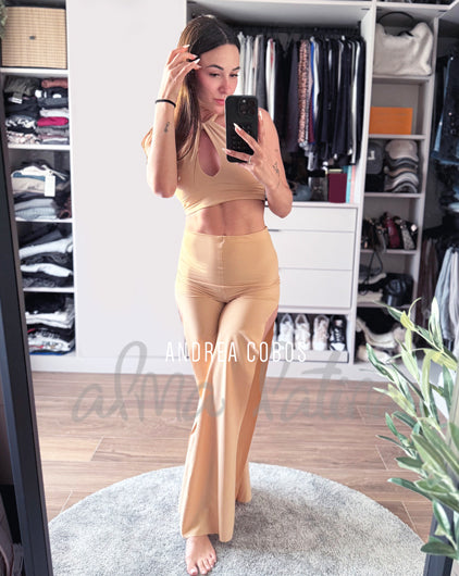 Pantalones de baile beige con abertura en el lateral. Con pata ancha, cintura alta y fruncido push-up entre los glúteos.