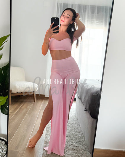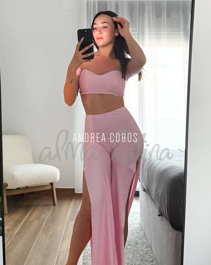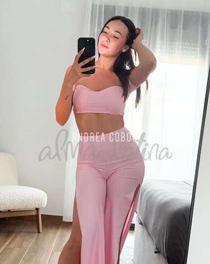 Pantalones de baile rosa con abertura en el lateral. Con pata ancha, cintura alta y fruncido push-up entre los glúteos.