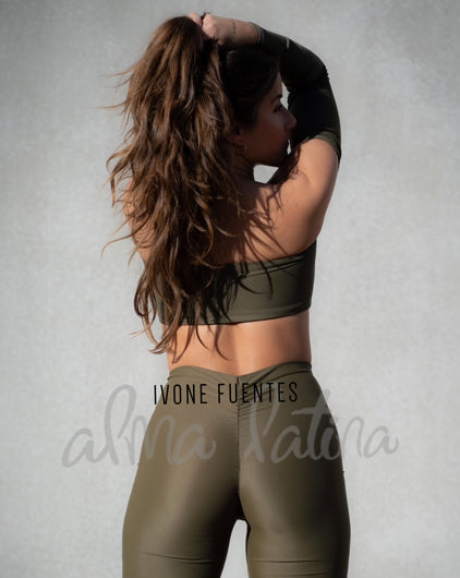 Pantalón de baile verde miitar de pata ancha, con fruncido en el glúteo y cintura alta. Es elástico y comodísimo a la vez que elegante.