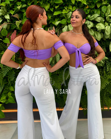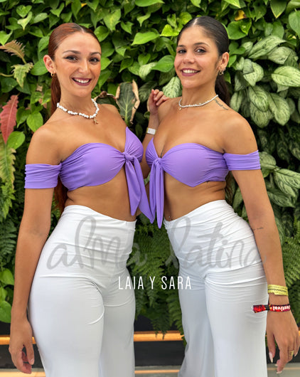 Top lila con mangas, escote en forma de corazón y lado anudable. Lleva COPAS INCORPORADAS y doble tejido en la zona del pecho para evitar transparencias, esto junto a su elasticidad hace que se adapte al cuerpo y te permite moverte con libertad.