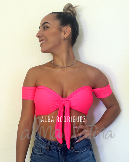 Top rosa flúor con mangas perfecto para una noche de social o para un congreso con dress code neón, lo más importante: no se mueve de su sitio ni un cm en toda la noche. Lleva copas incorporadas, el top y el lazo son independientes y puedes usarlo con o sin él.