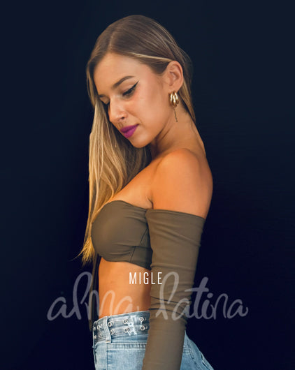 Top verde militar con mangas, escote en forma de corazón y lado anudable. Lleva COPAS INCORPORADAS y doble tejido en la zona del pecho para evitar transparencias, esto junto a su elasticidad hace que se adapte al cuerpo y te permite moverte con libertad.
