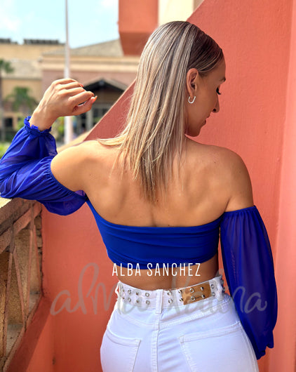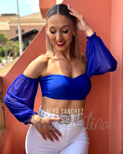 Nuestra prenda insignia en su versión delicada, top con mangas transparentes azul eléctrico hecho a mano. Combínalo con un leggings, falda o vaquero y serás la mas elegante de la noche. Lleva copas incorporadas, y tiene la mejor calidad que vas a encontrar.