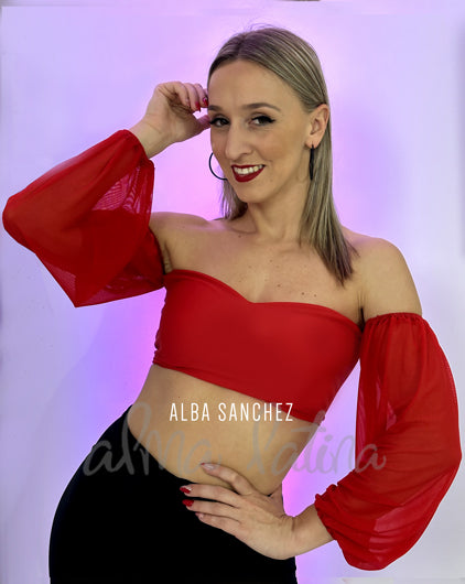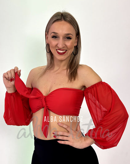 Nuestra prenda insignia en su versión delicada, top con mangas transparentes rojo hecho a mano. Combínalo con un leggings, falda o vaquero y serás la mas elegante de la noche. Lleva copas incorporadas, y tiene la mejor calidad que vas a encontrar.