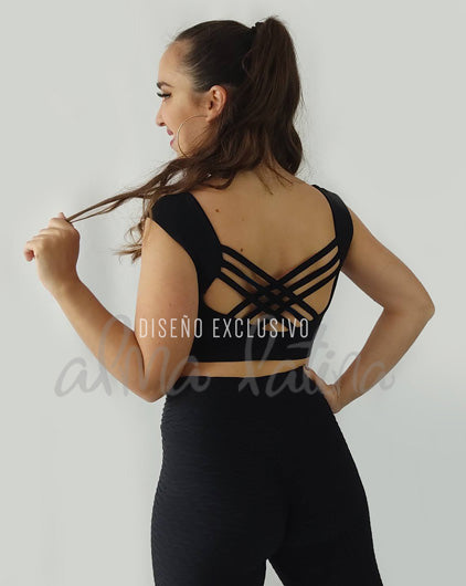 Top corto de danza con cruces negro para bailar, con escote en forma de corazón, manga ajustada al hombro y espalda abierta con un entramado de tiras que se cruzan. Lleva COPAS INCORPORADAS y doble tejido en la zona del pecho para evitar transparencias, esto junto a su elasticidad hace que se adapte al cuerpo y te permite moverte con libertad.