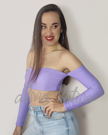 Top lila con mangas, escote en forma de corazón y lado anudable. Lleva COPAS INCORPORADAS y doble tejido en la zona del pecho para evitar transparencias, esto junto a su elasticidad hace que se adapte al cuerpo y te permite moverte con libertad.