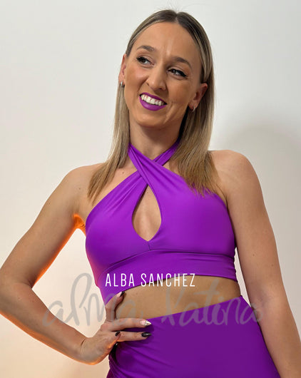 Top para bailar buganvilla, tiene la espalda totalmente descubierta, creando un cruce por delante justo encima del pecho y se anuda al cuello. Lleva COPAS INCORPORADAS y doble tejido en la zona del pecho para evitar transparencias, esto junto a su elasticidad hace que se adapte al cuerpo y te permite moverte con libertad.