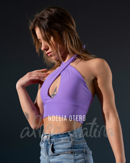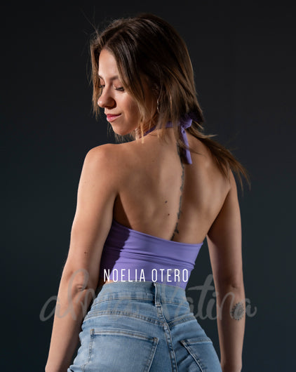 Top para bailar lila, tiene la espalda totalmente descubierta, creando un cruce por delante justo encima del pecho y se anuda al cuello. Lleva COPAS INCORPORADAS y doble tejido en la zona del pecho para evitar transparencias, esto junto a su elasticidad hace que se adapte al cuerpo y te permite moverte con libertad.